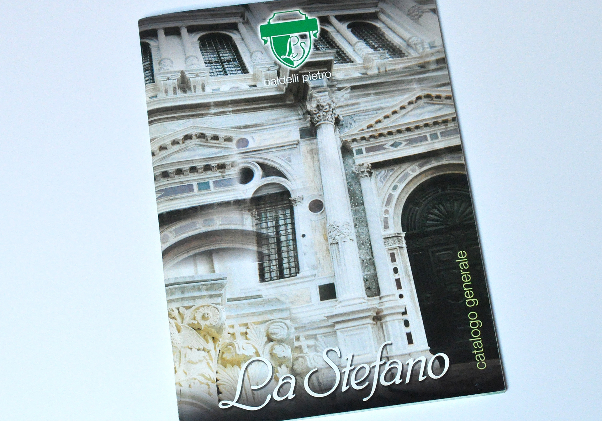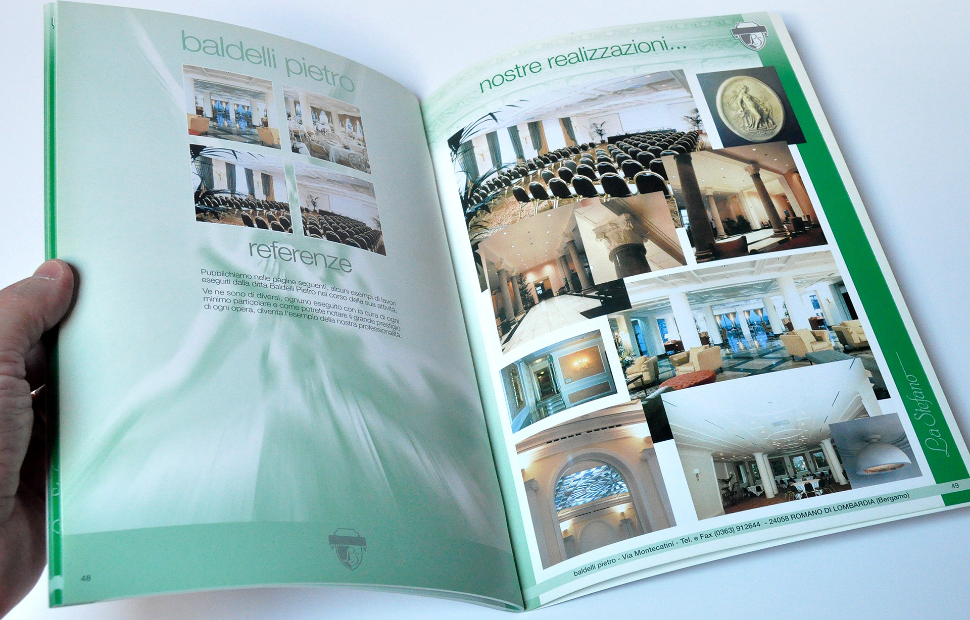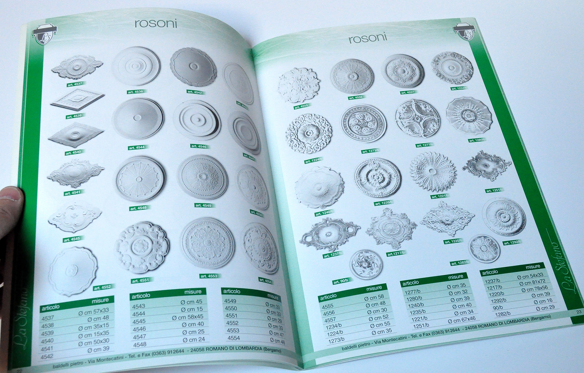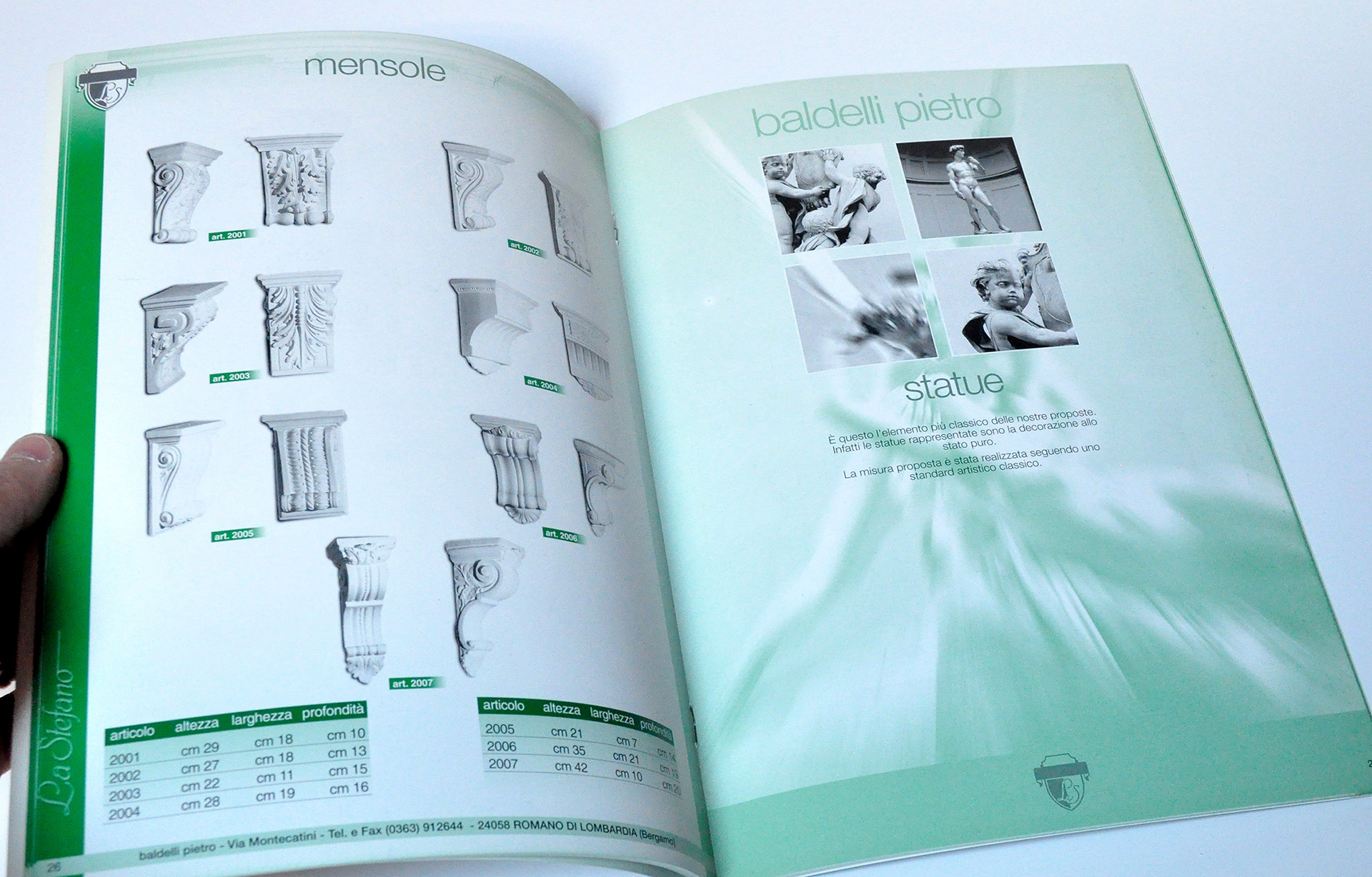 Catalogo della produzione di prodotti in gesso e cemento. Impostazione grafica, scansione, fotografia di oggetti e scontorno interamente realizzato in quadricromia
